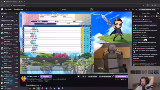 00:08:11Im Chat wird intensiv über die Fairness verschiedener Turnierformate debattiert. Der Streamer äußert Skepsis gegenüber Systemen, bei denen Spieler bereits nach zwei Runden ausscheiden, da TFT seiner Meinung nach eine höhere Anzahl an Spielen benötigt, um die tatsächliche Spielstärke fair zu ermitteln. Er teilt zudem Informationen über die Kommunikation mit dem Veranstalter Johnny mit und freut sich über die Teilnahme einiger bekannter Grandmaster-Spieler, während er sich auf den Start seiner eigenen Lobby vorbereitet.