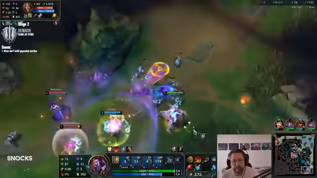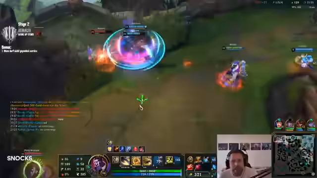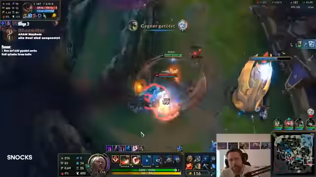 01:49:47Die Streamer starten ein Spiel im Aram Mayhem-Modus in Bilgewater. Dieser Modus besitzt besondere Regeln, die das Spiel unvorhersehbar machen. Die Streamer müssen mit den ihnen zugeteilten Champions zurechtkommen, die nicht ihre üblichen Picks sind. Es kommt zu lustigen und chaotischen Situationen, die den Unterhaltungswert des Streams erhöhen. Die Streamer zeigen, wie sie sich auch unter schwierigen Bedingungen anpassen und Spaß haben. Das Spiel endet mit einem Sieg, was die Moral des Teams weiter stärkt.