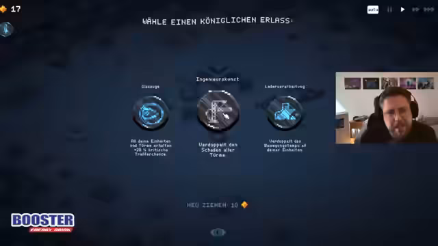 04:44:35Nach einer Niederlage entscheidet der Streamer für einen Neustart in 'Nine Kings'. Man spielt es 'safe' mit Türmen. Der Verlust eines Lebens führt zur Zuteilung einer 'Mauerbauer'-Karte, was das Problem 'problem fucking solved' sein soll. Der Streamer stellt einen 'Flammenturm' nach vorne, da dieser nicht sterben kann. Man levelt auf 'Stufe 3', um den Schaden der Türme zu verdoppeln. Die Karten 'Erdbauern' und 'Fallensteller' werden als 'useless' und 'terrible' abgewertet.