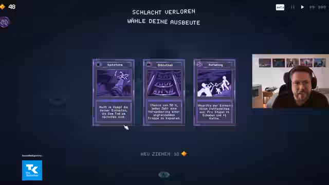 04:32:00Nach einem sehr starken Start im Spiel 'Nine Kings' entscheidet sich der Streamer, die 'Feuertürme' an der Front zu positionieren. Er beschreibt den Schaden als 'unschristlich' und 'tollend'. Nach einem Verlust von Leben und dem Fehlen von Frontline-Einheiten wird die Strategie angepasst. Der Fokus liegt auf dem Sammeln von Karten wie 'Mauer', 'Treffer' und 'Wurzel'. Trotz anfänglicher Erfolge verliert der Streamer eine Runde und restartet das Spiel, um eine bessere Kombination zu finden.