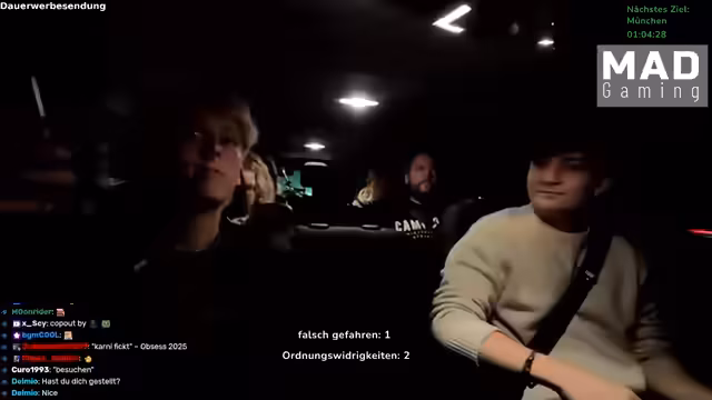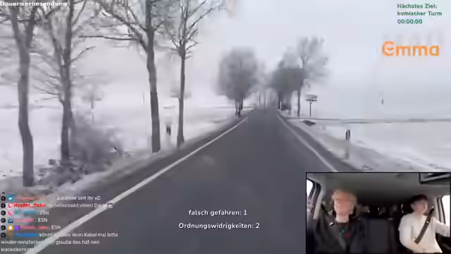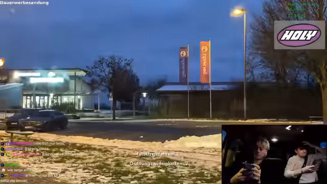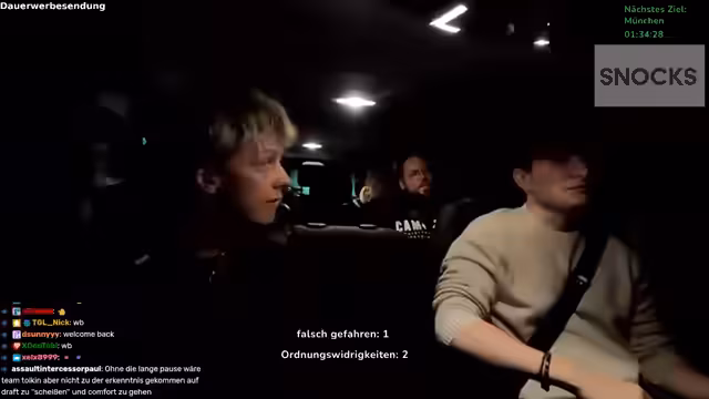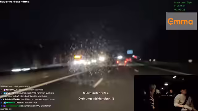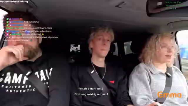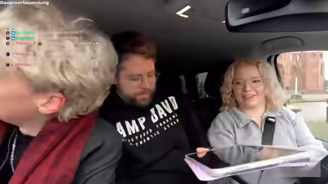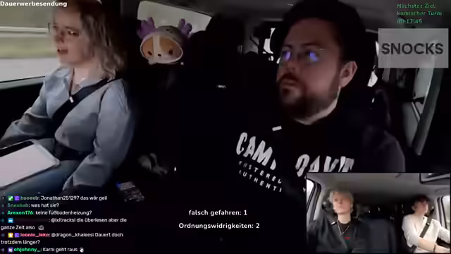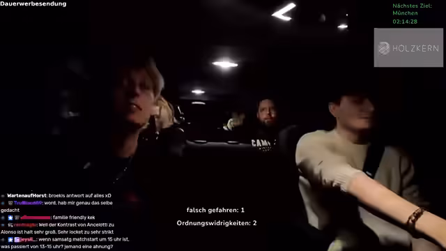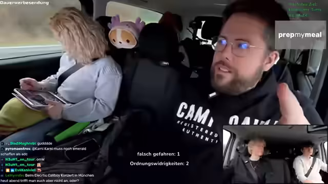 02:43:25Kani wird am Hauptbahnhof in Leipzig abgeholt, wobei die Gruppe humorvoll seine Adresse preisgibt und überlegt, ob er in 'Brückes Papier' wohnt. Die Begrüßung ist herzlich, und Kani muss sich noch bei Europecar akkreditieren, um das Mietauto fahren zu dürfen. Es wird über die Reisepläne gesprochen, darunter die Fahrt zum Thüringer Turm und die geschätzte Ankunftszeit. Die Möglichkeit, auf einem ADAC-Übungsplatz zu fahren, wird diskutiert, wobei die Regeln für Leihwagen und gesponserte Fahrzeuge berücksichtigt werden. Die Gruppe bedankt sich bei den Raids und Supportern, wobei humorvoll über die 'Finanzierung' des Streams und die Erwartung an die Zuschauer, 'reinzuzappen', gesprochen wird. Es wird über die Technik im Auto gesprochen, darunter GoPros und Bluetooth-Verbindungen, und es kommt zu einer humorvollen 'Polizei-Donation', die Kathleen beleidigen soll. Die vergessene Jacke von Bröki wird thematisiert, und Alina bietet ihre Ersatzjacke an. Die Diskussion schwenkt zu Kanis Fahrkünsten und der Möglichkeit, Ordnungswidrigkeiten zu sammeln, sowie zu der Debatte über das Verbot von Streams am Steuer.