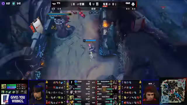 04:18:27Die frühe Spielphase beginnt mit einem aggressiven Play von Pace, der mit Boots und Dorans Blade startet und direkt ein Double Kill erzielt. Dieser frühe Vorteil für T1 wird als starker Auftrag gesehen, während G2 sich selbst in eine schwierige Lage gebracht hat. Die strategische Tiefe des Spiels wird hervorgehoben, insbesondere wie G2 versucht, mit einem Bard-Pick gegen die Bot-Lane-Kombo von T1 zu bestehen. Die Effizienz von Mundo im Jungle, der schneller farmt und invaden kann, wird betont. Die ersten Teamkämpfe zeigen die Stärke von T1, aber auch die Widerstandsfähigkeit von G2, die durch gute Plays und Kills zurück ins Spiel finden. Besonders Hans Sammer und Lavrov zeigen starke Leistungen und überleben aggressive Dives. Die Spannung bleibt hoch, da beide Teams um die Kontrolle des Spiels kämpfen.