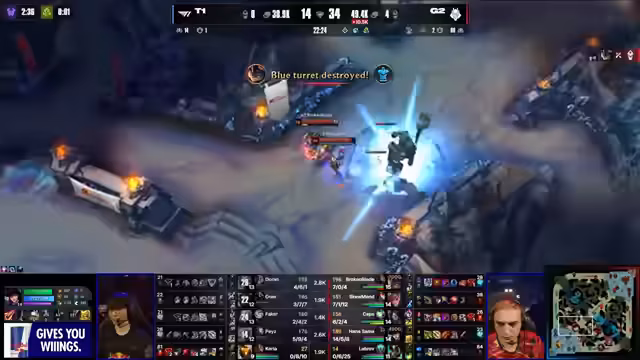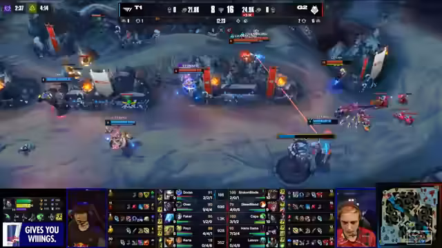04:34:02Broken Blade erweist sich als entscheidender Spieler und bleibt als einziger ohne Tod, während er auf Rumble dominiert. Die Teamfights werden immer intensiver, wobei Camille und Rumble großen Schaden anrichten. G2 setzt seinen aggressiven Spielstil fort, was zu einem doppelten Kill für Broken Blade führt. Caps brilliert mit schnellen Entscheidungen und eliminiert Gegner, was den Goldvorsprung von G2 auf 6000 erhöht. Trotz der Stärke von T1, insbesondere Faker, gelingt es G2, die Kontrolle zu behalten und wichtige Ziele zu sichern. Die Dominanz von G2 ist so groß, dass T1, der dreifache Weltmeister, keinen einzigen Turm einnehmen konnte. Die Zuschauer sind begeistert von der aggressiven Spielweise von G2, besonders wenn es um nichts geht. Die Diskussionen drehen sich um die Item-Builds und die bevorstehenden Teamfights, wobei die Stärke von Hans Summer und die Schwierigkeit, gegen ihn anzutreten, hervorgehoben werden.
