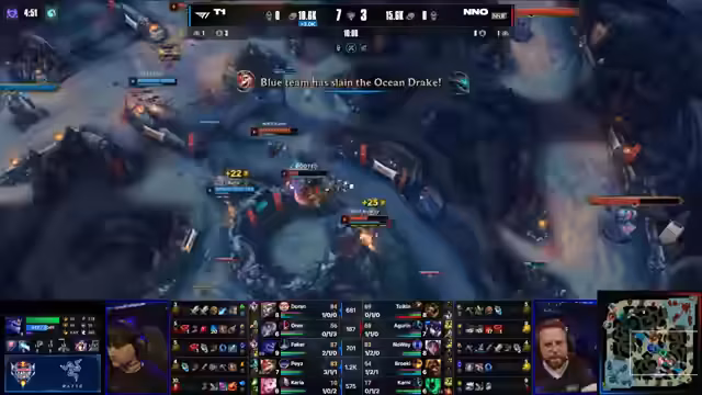 05:25:39Die Analyse des Drafts zeigte, dass die Topside von NNO mit Sejuani und Renekton theoretisch sehr stark war, besonders in Skirmishes. Die Botlane mit Brand und Thresh wurde jedoch als unsicher eingeschätzt, während T1 auf Seraphine setzte. Der Spielverlauf bestätigte die Befürchtungen bezüglich der Botlane von NNO, da sie Schwierigkeiten hatten. Faker zeigte sich in der Midlane dominant und konnte NoWay mehrmals ausschalten. Die ungewöhnlichen Picks und die aggressive Spielweise von T1 führten zu einem schnellen Goldvorsprung. Trotz einiger guter Plays von NNO, wie einem gelungenen Dive von Freddy, konnte T1 seine Überlegenheit ausspielen. Die Home-Crowd unterstützte NNO, doch die Dominanz von T1 war unübersehbar, was zu einem schnellen und einseitigen Spiel führte. Die ungewöhnlichen Champion-Picks trugen zwar zur Unterhaltung bei, konnten aber die Übermacht von T1 nicht aufhalten.
