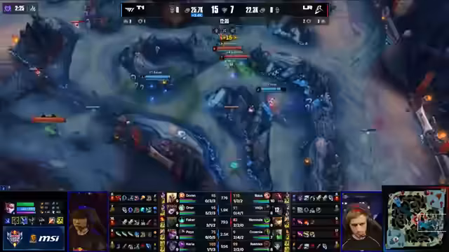 06:30:36Das Spiel entwickelt sich zu einem intensiven Schlagabtausch, wobei die Kayle von Doran noch Level sieben ist und Zeit zum Skalieren benötigt. Nemesis versucht, Pace im Jungle zu überlisten, was zu einem Doublelift führt, bei dem Nemesis den Condemn-Flash einsetzen muss. Die Situation wird für Baus immer schwieriger, da das Matchup gegen Kayle unspielbar wird, sobald sie Nashor's Tooth hat. Faker ist auf der Karte sehr aktiv und erzielt Kills, während Crowney mit seinem 0-4-Twitch und Dark Seal noch nicht richtig performt. Trotz des Goldrückstands von T1 gelingt es Los Ratones, Kills zu sammeln und den Goldvorteil zu übernehmen. Die Diskussion geht weiter über die ungewöhnlichen Picks und die Effizienz von Champions wie Twitch Support und Timo Jungle, die in diesem chaotischen Spiel überraschend gut funktionieren.