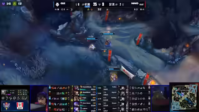 01:22:28In der späten Spielphase versucht NNO weiterhin, Kills zu erzielen, aber der Goldrückstand bleibt bestehen. Ein Engage-Versuch von Karni scheitert, da er nach Ablauf des Aftershocks zu verwundbar ist. Tolkien wird weiterhin ins Visier genommen und stirbt erneut. G2 baut seinen Vorsprung auf 7.000 Gold aus, hat zwei Drakes und den Rift Herald gesichert. Die Hosts kommentieren die Situation mit einer Mischung aus Humor und Resignation, während sie die Voice-Comms von Karni loben, die eine fantastische Stimmung verbreiten. Der Goldunterschied steigt auf 10.000, was die Hosts an alte Zeiten erinnert, als Spiele bei einem solchen Rückstand nicht neu gestartet wurden. Ein weiterer Teamfight führt zu einem Kill für NNO, aber Agurin verliert dabei viel Leben. Die Hosts betonen die Größe von No Way im Vergleich zu den G2-Spielern und scherzen über die physische Präsenz. Trotz des anhaltenden Rückstands und der Dominanz von G2 bleibt die Stimmung im Stream positiv und unterhaltsam.