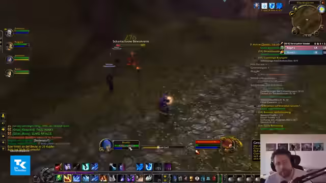 00:58:13Die Gruppe beginnt mit dem Dungeon 'Friedhof'. Der Streamer konzentriert sich auf den Kampf gegen einen Elite-Gegner, der sich ein Magieschuttschild zaubert. Er erläutert die Mechanik des Gegenzauberns (Kick) und Magiebanns, um solche Schild zu entfernen. Es wird eine klare Taktik entwickelt, bei der der Schaman die Magie bannen soll, um den Schaden des Zauberers zu unterbinden. Der Streamer versucht, das Gelernte direkt umzusetzen.