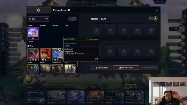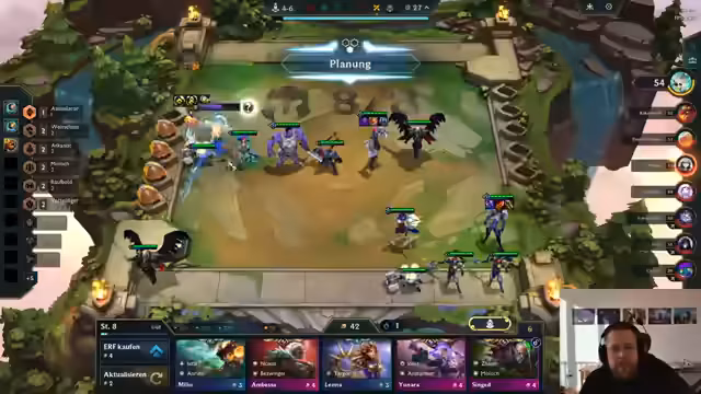 05:52:36Eine Runde wird mit einem unzufriedenen Board gespielt, das keine idealen Items hat. Die strategische Entscheidung wird getroffen, Galio zu spielen, obwohl die dafür benötigten Zona und Jarvan fehlen. Die Wichtigkeit einer starken Frontline mit Garen oder Tarek auf Stufe 2 wird betont. Es wird ein klares Ziel verfolgt, den Kaiser freizuschalten, und Rakethai wird als nicht-contestet eingestuft.