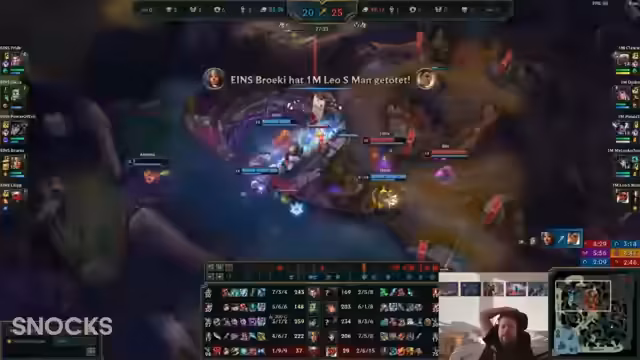 04:22:34Im Spätgame konzentriert sich das Team auf das Ziel, ein 'One-Shot' zu ermöglichen und den gegnerischen Baron Nashor zu kontrollieren. Der Streamer, stark gefeedet und mit vollem Inventar, versucht das Team zu einem gut getimten Engagement zu bewegen, fühlt sich aber letztlich von den Entscheidungen des Teams im Stich gelassen. Anschließend reflektiert er das Spiel und kritisiert die fehlende Anpassungsfähigkeit im Teamfight, insbesondere im Spätgame. Er zeigt auf, dass er selbst aufgrund seiner Geduld und Championwahl einen strategischen Vorteil hatte, das Team aber taktische Fehler machte, die das Spiel kosteten.