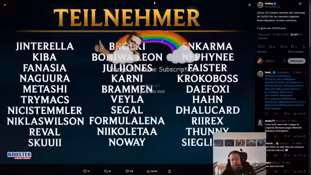 03:55:51Es wird ein kommendes Aram-Turnier bei der Gamescom angekündigt, das im Gruppenformat mit sieben Runden und ständig wechselnden Teammitgliedern stattfinden wird. Der Streamer betont den Spaßcharakter und rät zu weniger Verbissenheit. Wichtige Details sind die Nutzung von Riot-Accounts für Fairness und die Vorstellung des Turnierformats, einschließlich des Finales mit den Top-2-Spielern.