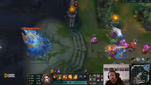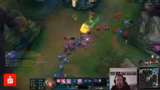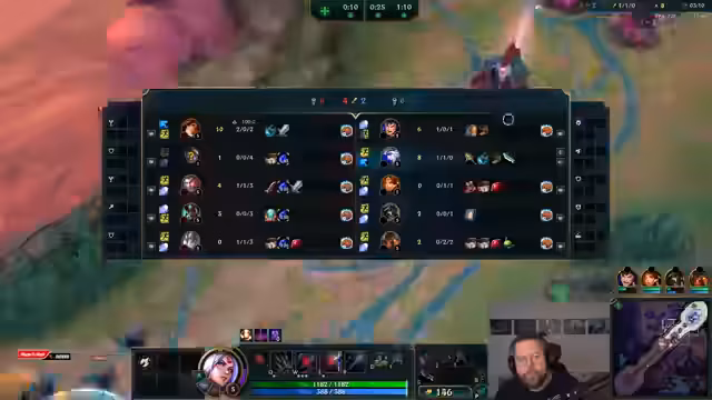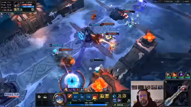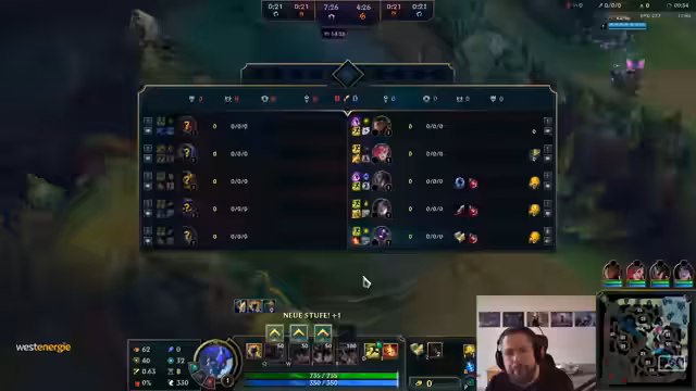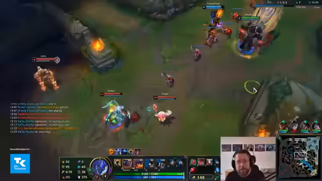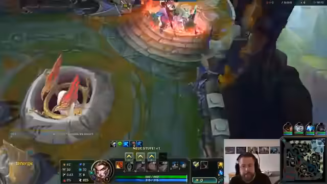 06:35:35Das Spiel ist in einer intensiven Kampfphase. Das Team versucht, die Initiative zu ergreifen, indem es einen gezielten Angriff auf die gegnerische Jinx plant. Der Streamer gibt klare Anweisungen, zu warten bis seine Ultimate bereit ist, und fürchtet sich vor der starken Frontline des Gegners. Ein Engage wird versucht, scheitert aber, da Gegner wie Malzahar und Poppy das Team überrollen. Trotzdem bleibt das Team kampfbereit und hofft auf eine Gelegenheit, da mehrere Ultimate-Fähigkeiten noch verfügbar sind. Der Druck steigt, da mehrere Teammitglieder auf niedrigerem Level sind und noch keine Ultimates besitzen.
