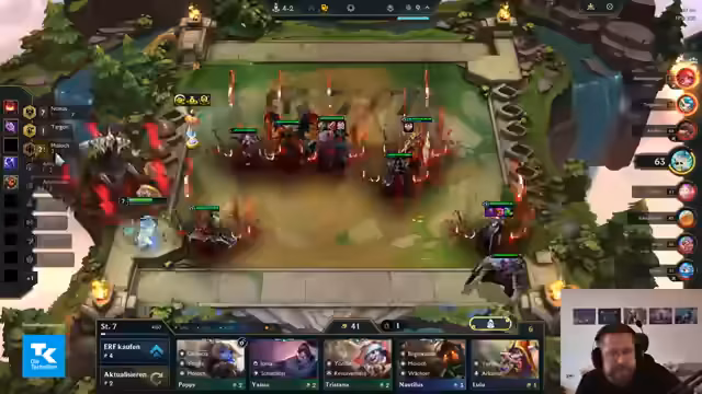 04:12:39Nach dem League-Spiel wechselt der Streamer zu TFT und plant nur eine Runde, um seinen Account für das Turnier vorzubereiten. Er wählt eine Noxus/Yordle-Kombination und experimentiert mit Comp-Builds, darunter ein Leblanc-Reroll. Das Ziel ist es, eine starke Konstellation mit Traits wie dem Yordle-Emblem zu finden. Er kommentiert den Abnutzungseffekt von Items wie Protobelt kritisch.