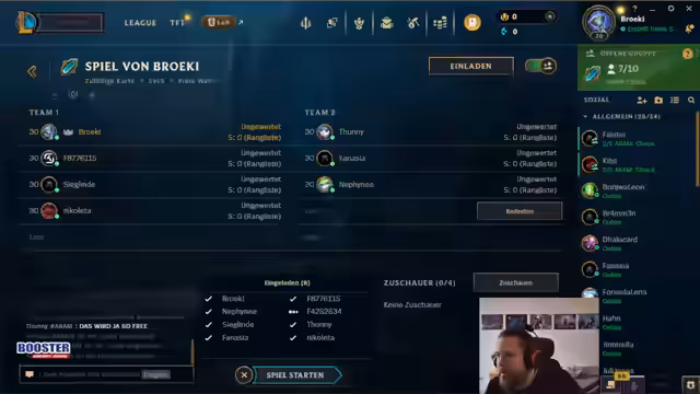 00:00:00Der Stream beginnt mit der Begrüßung des Chats und der Ankündigung des heutigen Programms. Es ist geplant, zunächst ein paar Solo-Q-Spiele zu spielen, danach in das Spiel Teamfight Tactics (TFT) zu wechseln. Um 15 Uhr steht dann ein Abendturnier, das Aram Mayhem heißt, auf dem Plan. Der Streamer erwähnt, dass er seinen Account noch einstellen muss und um 14:30 Uhr startbereit sein wird, um dann in das Turnier einzusteigen.