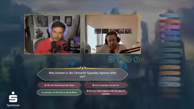 03:22:05Das Quiz beginnt mit einer leichten Frage zum Thema League of Legends, gefolgt von einer kniffligeren Bronze-Frage. Die Fragen sind auf den Gast, Bröki, zugeschnitten und beziehen sich auf seinen Spitznamen 'Brokschatilter' und die Eintracht Spandau-Hymne. Nachdem Sola einige Fragen korrekt beantwortet hat, stellt ihm der Quizmaster eine Frage zur Blue-Essenz-Kosten des Champions Jhin, was die Diskussion über Champion-Preise und den Einsatz von Jokern auslöst.