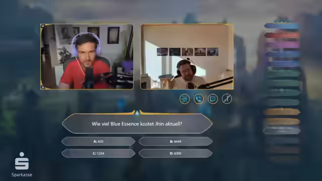 03:32:05Bei der Frage nach den Kosten des Champions Jhin nutzt Sola den Günther-Jauch-Joker. Die Diskussion über die Kosten wird aufgegriffen, wobei der Streamer erklärt, dass Riot Games die Preise für alle Champions insgesamt deutlich gesenkt hat und aktuell kein Champion teurer als 3150 Blue Essence ist. Nach der Beantwortung der Frage wird deutlich, dass Sola mit dem Ergebnis zufrieden ist, und der Streamer die nächsten Quiz-Runden erwartet.