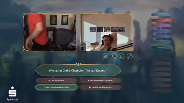04:03:20Die Frage nach Corkis Champion-Titel auf Deutsch ist für den Streamer eine einfache, da er auf Deutsch spielt. Die korrekte Antwort 'der kühne Bombenschütze' wird mit hoher Confidence gegeben. Die anderen Optionen, wie 'der Jodelpilot' oder 'die dröhnende Jodelnatter', werden als fiktive oder lore-basierte Bezeichnungen entlarvt.