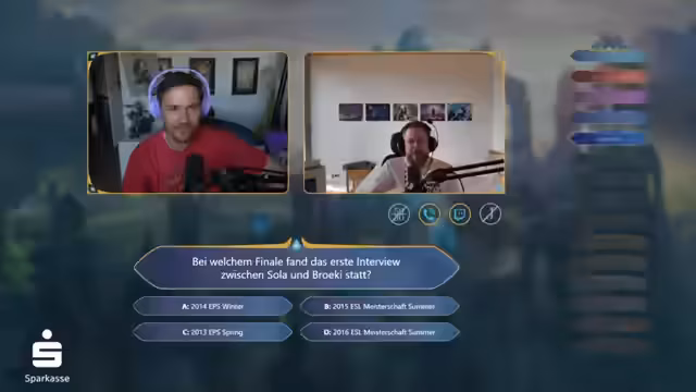 04:09:09Für die Diamond-Frage wird der Streamer nach dem Finale seines ersten Interviews mit Bröki gefragt. Die Optionen beziehen sich auf verschiedene ESL- und EPS-Events von 2013 bis 2016. Nach Überlegungen und der Erinnerung, dass er 2014 gegen Klang Dax gewonnen hat, identifiziert er die korrekte Antwort als '2014 EPS Winter'.