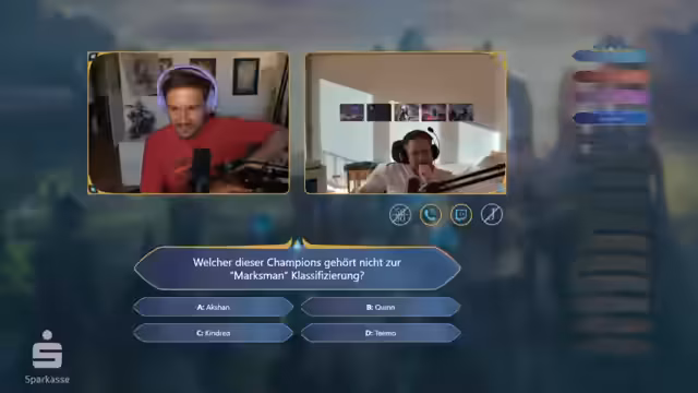 04:12:52Bei der Master-Frage soll der Streamer identifizieren, welcher Champion nicht zur Marksman-Klasse gehört. Die Optionen sind Aksan, Quinn, Kindred und Teemo. Der Streamer argumentiert, dass Aksan der neuste Champion sei und daher von Riot absichtlich nicht als Marksman klassifiziert werde. Die Antwort Aksan wird als falsch markiert, da laut LOL-Client alle vier Champions als Marksman gelistet sind. Der Streamer gewinnt jedoch Glück, da laut offizieller Definition Quinn eigentlich kein Marksman ist, sodass er trotz der falschen Antwort eine Rune weiterkommt.