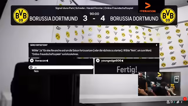 00:02:48Nach einigen organisatorischen Vorbereitungen und technischen Einstellungen an den Controllern beginnt das erste Spiel. Die Teams entscheiden sich für eine Partie mit Gala-Trikots, da diese optisch dem BVB-Design ähneln. Das Spiel startet sehr dynamisch mit spektakulären Toren wie einem direkten Freistoß. Nach einer Pause wegen eines technischen Problems gelangt man zurück in das Spiel, jedoch kommt es zu vermehrten Verwirrungen und Abseitspfiffen.