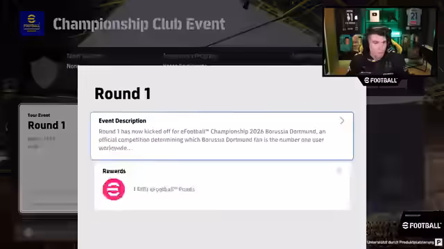00:04:24Der Stream beginnt mit dem Streamer, der sich für technische Schwierigkeiten und den langen Start entschuldigt. Es wird die Teilnahme an der Borussia Dortmund E-Football-Championship angekündigt, bei der man durch ein Abonnement via Twitch Prime qualifiziert werden kann. Der Streamer stellt fest, dass er für Borussia Dortmund in dem Club-Event spielt, und bittet das Publikum um Interaktion im Chat. Er betont, dass er mit dem eFootball-Spielen noch nicht ganz vertraut ist und sich etwas wie ein Anfänger fühlt.