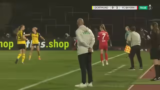 Borussia Dortmund unterliegt im DFB-Pokal der Frauen dem Titelverteidiger Bayern München mit 0:2. Pernille Harder sorgte mit einem Doppelpack für die Entscheidung. Trotz der Niederlage zeigte Dortmund eine kämpferische Leistung, insbesondere Torhüterin Laura van der Lahn überzeugte. In der zweiten Halbzeit gestaltete Dortmund das Spiel ausgeglichener, konnte aber die starke Defensive der Bayern nicht überwinden.
