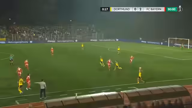 01:31:13Das Spiel wird kurz unterbrochen, als Steenweich von Borussia Dortmund verletzt zusammenbricht. Sie muss den Platz verlassen und wird durch Mia Burger ersetzt. Trotz des Rückstands hält die Stimmung im Dortmunder Stadion hoch. Bayern München kontrolliert das Spiel und hat weitere Torchancen, die jedoch nicht genutzt werden. Das Spiel endet mit einem 2:0-Sieg für Bayern München, das damit in die nächste Pokalrunde einzieht und seinen Titel verteidigt. Borussia Dortmund kann jedoch mit Leistung und Zuschaueraufkommen überzeugen.