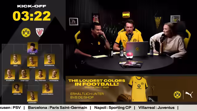 00:00:03Die Streamer starten die Watchparty zum Champions-League-Heimspiel gegen Athletic Club Bilbao. Lin ist wieder mit dabei. Es wird auf die verschiedenen Chat-Kanäle verwiesen und die Zuschauer werden zur Interaktion aufgefordert. Ein roter Buzzer wird gezeigt, der für ein geplantes Fußball-Bingo-Spiel verwendet werden soll. Die Aufstellung des BVB wird thematisiert, wobei einige Änderungen im Vergleich zum vorherigen Spiel gegen Mainz festgestellt werden. Virassi, Ryerson, Süle, Bellingham und Chukwoy Meka rücken in die erste Elf, während Schlotterbeck, Kuto, Meca, Brandt und Maxi Bayer zunächst draußen bleiben. Die Abwesenheit von Schlotterbeck in der Startelf wird überrascht zur Kenntnis genommen. Adeyemi wird für seine aktuelle Form gelobt. Es wird erwähnt, dass Nico Williams von Bilbao nicht spielt, was als Vorteil für den BVB gesehen wird. Marcel Sabitzer äußert sich nach der Ankunft des Teams im Stadion über seine Vorbereitung auf das Spiel und die besondere Stimmung bei Europapokal-Nächten in Dortmund. Er erwartet eine dominante Leistung des BVB mit viel Intensität und Leidenschaft.