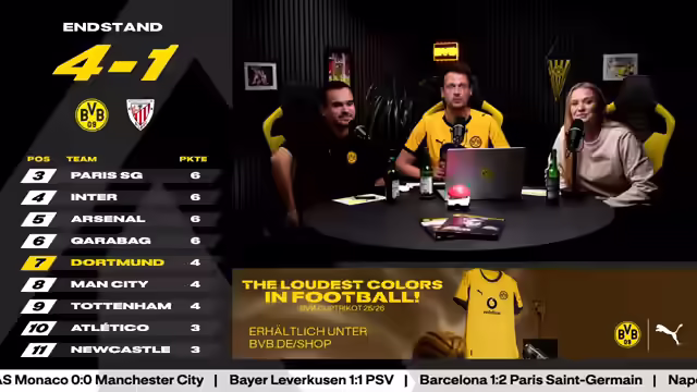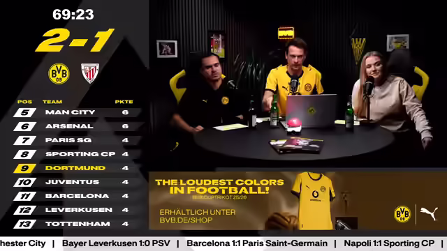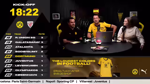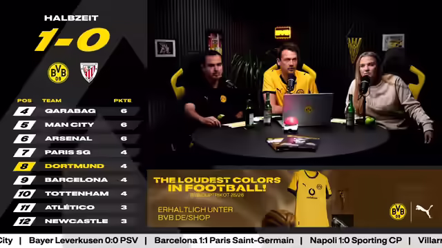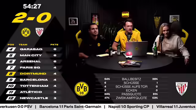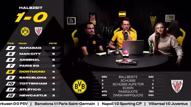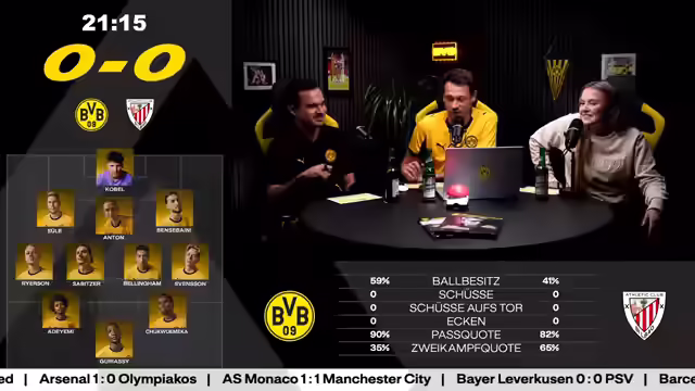 Die BVB-Watchparty begleitet das Champions-League-Spiel gegen Bilbao mit Analysen zu Aufstellung und Spielverlauf. Bingo sorgt für zusätzliche Spannung. Merchandise, Kabinen-Einblicke und Halbzeitfazits runden das Erlebnis ab. Die zweite Halbzeit bringt weitere Wendungen und Diskussionen über Spielerleistungen.