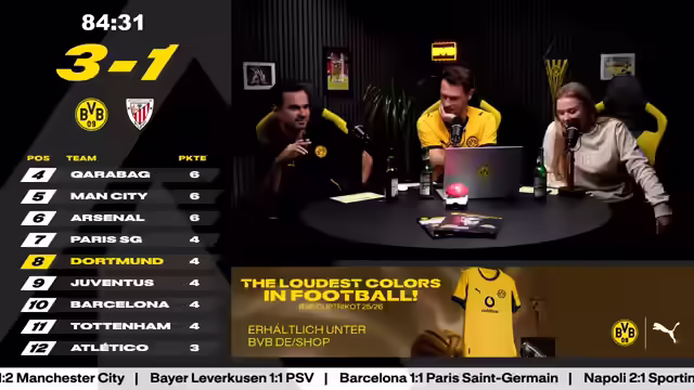 01:23:34Marco Reus und Adiemi werden als Lieblingsspieler genannt. Die Frage nach einer roten Karte im Spiel wird verneint. Adjemi und Kobel werden als starke Spieler hervorgehoben. Es wird diskutiert, ob der BVB unter die ersten acht kommt. Die Wichtigkeit, Heimspiele zu gewinnen, wird betont. Es wird ins Stadion zu Christoph und Boris Ruppert geschaltet, um deren Halbzeit-Fazit einzuholen. Boris lobt Bremer und das Tor zum 1:0, kritisiert aber auch den Schiedsrichter für inkonsistente Entscheidungen. Er beschreibt den BVB als Passmaschine, die jedoch noch nicht wirklich torgefährlich ist. Ernesto ist wieder da und bringt einen Apfel mit. Die Mannschaften kommen zurück aufs Feld und Bilbao wechselt dreifach. Die zweite Halbzeit beginnt und es wird über den mitgebrachten Apfel gesprochen. Das Bingo-Spiel wird erneut thematisiert und die Mitte gegen die leichte Variante ausgetauscht. Süle macht ein gutes Comeback-Spiel. Der Grund für den Apfelkonsum wird erklärt. Der Ballbesitz liegt nun eher bei Bilbao.