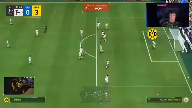 01:14:44Der Kommentator kritisiert den BVB-Spielstil als zu risikoreich und unorganisiert, ähnlich wie es oft beim echten Team beobachtet werde. Das nachfolgende 1 gegen 1 Match gegen Braunschweig gestaltet sich für die Dortmunder zunächst schwierig. Der Gegner dominierte die erste Halbzeit statistisch mit mehr Torschüssen und besseren Chancen. Dortmund kämpft sich ins Spiel und geht durch einen Ballverlust der Braunschweiger in Führung, mit der Halbzeitpause endet das Match vorerst unentschieden.