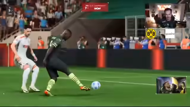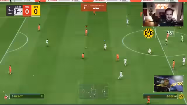 00:07:20Das Spiel beginnt mit technischen Abstimmungen und der Prüfung der Controller-Einstellungen. Die Farben der Trikots von BVB (türkisblau) und Köln (grün) sind kaum unterscheidbar, was die Orientierung erschwert. Beide Teams agieren von Beginn an taktisch klug, wobei Köln einen hohen Druck aufbaut und den Ballbesitz hat. Die erste Halbzeit ist geprägt von spannenden Aktionen, bei denen beide Teams mehrere Torchancen hatten, aber ohne Torerfolg. Der BVB agierte dabei geduldig und suchte über Flanken und Doppelpässe den Weg zum Tor.