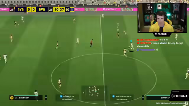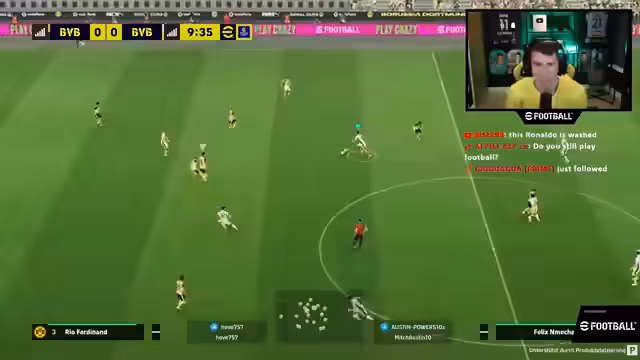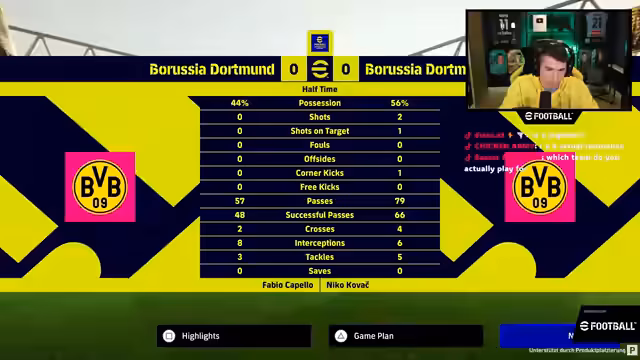 00:02:08Der Stream beginnt mit technischen Vorbereitungen und dem Einstieg in das offizielle Borussia Dortmund eFootball-Tournament. Mitch befindet sich in Runde 3 der Borussia Dortmund eFootball Club Championship. Er berichtet überrascht vom Erreichen dieser Runde, ist sich aber der hohen Qualität des Wettbewerbs bewusst. Nach anfänglichen Problemen mit der Musik wählt er sein Team, wobei er eine Mischung aus Dortmund-Spielern und Legenden wie Cristiano Ronaldo, Kylian Mbappé, Gareth Bale und Ruud van Nistelrooy zusammengestellt hat. Er äußert seine Skepsis, mit seinem Team gegen hohe Team-Bewertungen bestehen zu können, und stellt fest, dass dies sein erstes 3D-Spiel in der eFootball-Reihe ist.