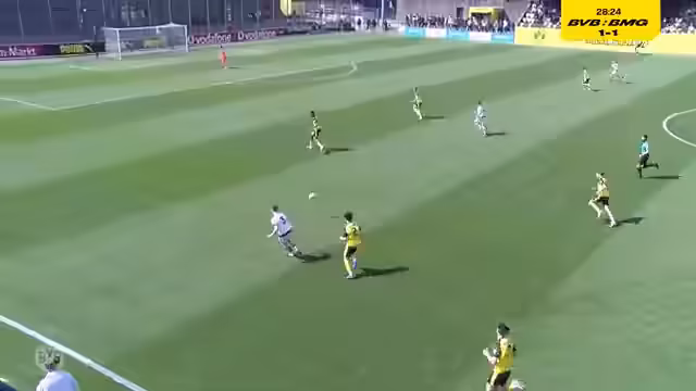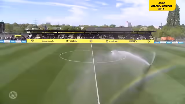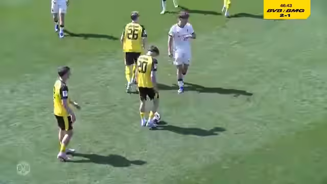 00:45:08Knapp vor der Pause erhöhte Jannis Tunkel in der 40. Minute auf 2:1 für die Borussia. Das Tor resultierte aus einer schnellen Gegenattacke und zeigte Tunkels unbändige Laufstärke. Besonders bemerkenswert war, dass die Dortmunder trotz des Doppeltervorsatzes in der Defensive weiter konsequent agierten und kaum Raum für Gladbacher Stürmer ließen.