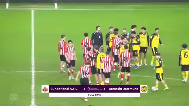 01:37:15In der Schlussphase verstärkt Sunderland den Druck und erzielt in der 82. Minute durch einen Konter nach einer Flanke den 1:3-Ehrentreffer. Trotz dieses Treffers bleibt der BVB ruhig und verteidigt mit Konsequenz den knappen Vorsprung. Durch Cleverness und eine starke Arbeitsleistung, wie sie z.B. von Tim Degener gezeigt wird, wird das Spiel über die Zeit gebracht. Am Ende siegt Borussia Dortmund verdient mit 3:1 und qualifiziert sich somit für das Viertelfinale des Premier League International Cups.