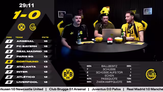 00:48:23Julian Brandt trifft in der 18. Minute zum 1:0 für den BVB. Das Tor resultiert aus einer schönen Kombination, die mit Fabio Silva beginnt. Der Treffer wird nach kurzer Prüfung anerkannt, nachdem zunächst eine Handspieldiskussion um Silvas vorherige Aktion im Raum stand. Nach dem Tor belegt der BVB den vierten Tabellenplatz und der Streamer verleiht dem Erfolg durch einen sogenannten 'Knuck' Ausdruck. Die sportliche Bedeutung des Treffers für die Tabellensituation wird hervorgehoben.