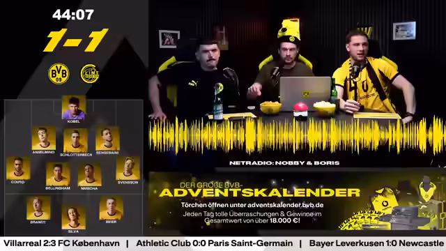 00:30:57Das Spiel ist angelaufen. Die Kommentatoren Boris und Nobby vom Netradio übernehmen die Beschreibung. Der BVB ist Tabellensechste und hat heute die Chance, auf Rang drei vorzurücken. Die Heimbilanz ist stark, nur eines der letzten 20 Heimspiele wurde verloren. Die bisherigen Partien gegen norwegische Teams waren immer sehr torreich. Der BVB dominiert den Ballbesitz und sucht über beide Seiten den Weg ins gegnerische Strafraum.