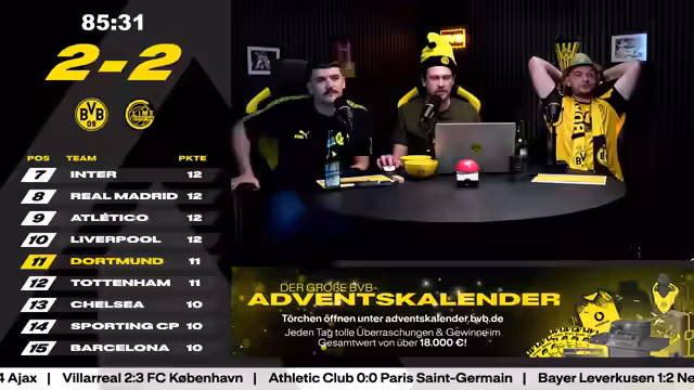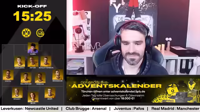 01:34:46Zu Beginn des Abschnitts werden technische Probleme des Streams angesprochen, die eine Unterbrechung der Live-Übertragung notwendig machen. In der Zeit wird eine Halbzeitanalyse präsentiert, bei der der BVB einen Ballbesitz von über 50% aufweist, aber trotz dieses statistischen Vorteils wenig konkrete Torchancen erarbeitet. Eine Spielkulisse mit Fans auf der Südtribüne und im Stadionradio wird ebenfalls erwähnt, die für eine besondere Atmosphäre sorgt, während der Druck auf dem Spielfeld stetig zunimmt.