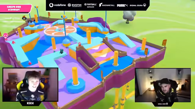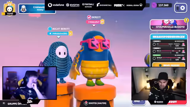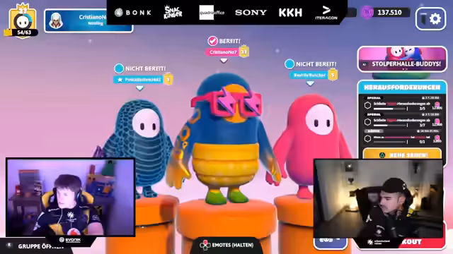 00:02:31Hauptsächlich widmet sich der Stream dem Spiel Fall Guys. Nach anfänglichem technischem Hickhack gelingt es Erné und Lucas, in einem gemeinsamen Spiel zu starten. Sie durchlaufen verschiedene Modi wie Knockout und Royal Fumble, wobei sie eine besonders chaotische Runde in einer Party-Promanden-Map erleben. Erné beschreibt den Spaß an dem entspannten Zusammenspiel, während sie sich während des Spiels auch unterhalten. Ein ständiges Thema sind jedoch wiederkehrende technische Probleme, die dazu führen, dass das Spiel neu gestartet oder die Verbindung unterbrochen werden muss, was die Stimmung kurzzeitig trübt.