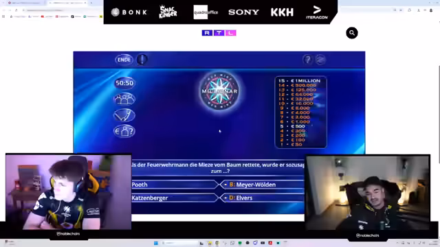 00:40:55Nach mehreren gescheiterten Versuchen, in Fall Guys zu spielen, wechseln die Streamer zu einem anderen Format: Sie spielen eine Runde 'Wer wird Millionär?'. Hier wird der Gastgeber als Hauptmann bezeichnet, der die Fragen stellt und die Tipps von Erné und Lucas entgegennimmt. Sie nutzen dabei verschiedene Joker wie den Publikumsjoker, um bei schwierigen Fragen Unterstützung zu erhalten. Die Runde ist geprägt von einem Wettbewerb, ob sie die Millioneneuro-Frage richtig beantworten können. Parallel dazu unterhalten sie sich über verschiedene Spiele wie Pokémon TCG und GTA IV-DLCs, die sie zocken möchten.