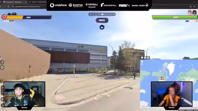 00:15:15Nach dem Aufstellungstipp starten die beiden ins Spiel GeoGuessr. Fiona gibt an, nur wenig Erfahrung mit dem Spiel zu haben, während Ali sich selbst als „scheiße in Geografie“ beschreibt. In der ersten Runde haben sie Schwierigkeiten, die Orte korrekt zu identifizieren. Sie raten auf kontinentale Ebene, erkennen aber auch Details wie Straßenschilder oder Kfz-Kennzeichen. Fiona gerät bei der ersten Schätzung um 3800 Punkte daneben, was zu Beginn einige Frustmomente verursacht.