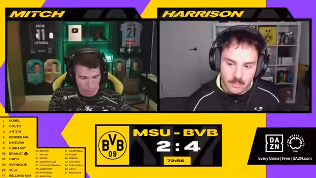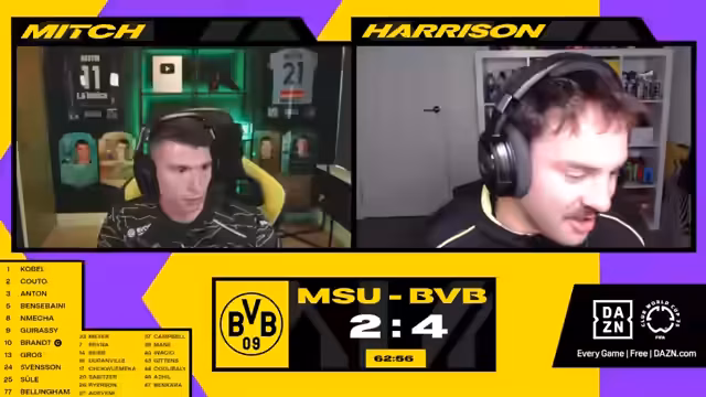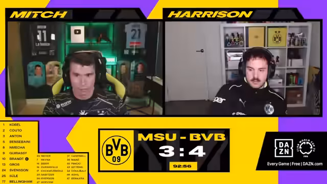 00:00:50Das Spiel beginnt mit einem frühen Tor zum 4:1. Es gab kurzzeitige Verwirrung im Chat durch falsche Spielstandangaben. Der Kommentator betont, dass man Chancen nutzen muss, auch wenn ein Gegentor unglücklich durch eine Abweichung entsteht. Später wird ein Freistoß erwähnt, und es wird spekuliert, dass in den nächsten fünf Minuten Auswechslungen stattfinden könnten, da einige Spieler sich bereits aufwärmen. Kurz darauf fällt ein Tor zum 4:2, was im Chat für Aufregung sorgt, da einige den Torschützen fälschlicherweise identifizieren. Es wird festgestellt, dass Dortmunds Gegner nun mehr Selbstvertrauen zeigt und stärker presst. Die Kommentatoren diskutieren über die Notwendigkeit einer besseren Verteidigung bei Standardsituationen, nachdem ein Spieler nach einem solchen Standard verletzt liegen bleibt.