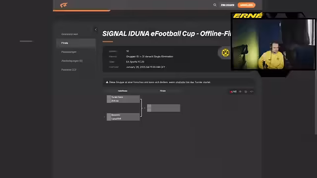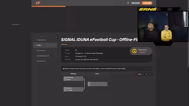 00:13:43In Gruppe A haben sich Daniel Fee und Lukas vom BVB für das Halbfinale qualifiziert. In Gruppe B sind Basilio und Ali weitergekommen, wobei Basilio den direkten Vergleich gegen Ali gewonnen hat und somit Erster wurde. Die Halbfinalpaarungen lauten Basilio gegen Lukas und Daniel Fleck gegen PvP-Ali. Es wird hervorgehoben, dass durch die Paarung Daniel Fleck gegen Ali in jedem Fall ein Mitglied des PvP-Funkballteams ins Finale einziehen wird. Es wird die Frage aufgeworfen, ob die Halbfinalspiele parallel oder nacheinander stattfinden werden. In 14 Minuten soll es mit den Halbfinals weitergehen. Der Streamer äußert seine Vermutung, dass es zu einem BVB-Finale kommen wird, glaubt aber, dass Ali sich im Halbfinale durchsetzen wird.