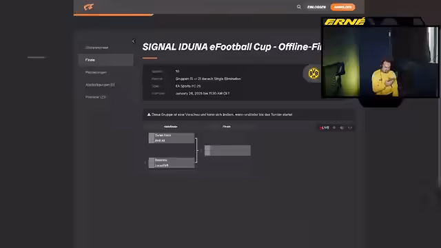 00:36:42Es wird erklärt, dass das Signal des BVB-Signal über den Wahlkampf stattfindet. Zwölf Leute hatten sich qualifiziert, aber es sind krankheitsbedingt einige ausgefallen, weswegen es heute zwei Fünfergruppen gibt, wo jeweils die ersten beiden weiterkommen. Es wird nur ein Spiel gespielt, quasi, wo wir rückspielen. Der Streamer äußert seine Vorfreude auf das Spiel Daniel gegen Ali, da Daniel der Einzige ist, der noch dabei ist, der nicht so gut ist. Wenn er sich da durchsetzt und so beweist, wäre er sehr stark. Er ist immer für den Außenseiter.