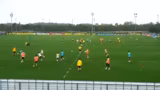 01:05:57Die zuvor geübten Grundlagen werden in einem Kleinspiel angewandt. Die Spieler trainieren Anspielstationen, schnelles Weiterleiten des Balles und Positionswechsel. Es geht darum, das im Kleinen Geübte auf das große Spielfeld zu übertragen. Nach Balleroberung wird der Gegenangriff gespielt. Arne Wessers erzielt den ersten Torschütze des Trainingscamps. Felix Metzger überzeugt durch dynamische Bewegungen und erste Ballkontrolle.