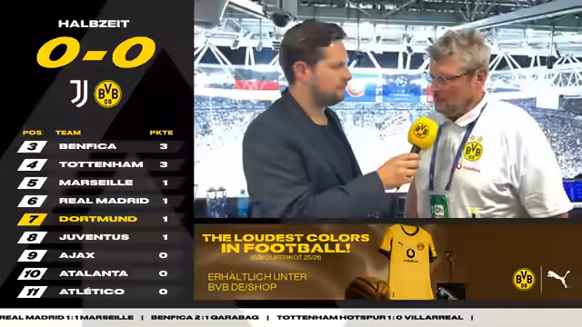 01:09:21Die erste Halbzeit wird analysiert, wobei die defensive Stabilität des BVB hervorgehoben wird, während man sich offensiv mehr Aktionen wünscht. Der Ballbesitz lag bei 56 Prozent für den BVB, aber Juve hatte mehr Torschüsse (7 zu 2) und Ecken (3 zu 2). Beide Mannschaften liefen fast 60 Kilometer. Es wird diskutiert, ob zur Halbzeitpause gewechselt werden sollte, aber man entscheidet sich dagegen, der Mannschaft die Chance zu geben, sich weiterhin zu beweisen und ab der 60. Minute je nach Spielstand zu reagieren. Felix Matcher und Adeyemi werden positiv hervorgehoben. Es wird kurz über das Set im Studio gesprochen, insbesondere über einen originalen BVB-Wimpel und ein Stadion-Heft aus der Vergangenheit. Anschließend wird Min, der sich im Stadion befindet, angerufen. Er berichtet von der Stimmung hinter dem Tor und erwähnt ein Feuerwerk vor dem Spiel. Min tippt auf einen 1:0-Sieg für den BVB und verabschiedet sich, um seiner Arbeit nachzugehen.