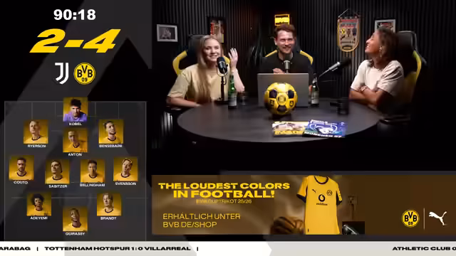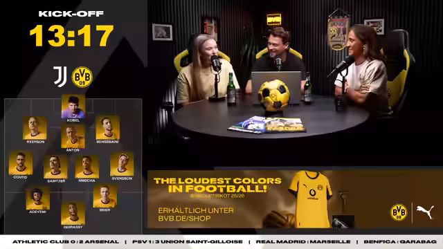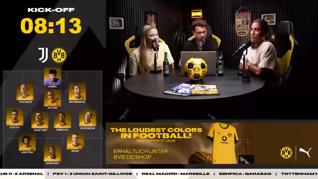 00:05:11Die Watchparty für das Champions-League-Spiel Juventus Turin gegen Borussia Dortmund wird angekündigt. Neben dem Moderator Stefan Gable sind auch Lin, ein großer BVB-Fan, und Jenske, eine Spielerin der BVB-Frauenmannschaft, als Experten dabei. Lin erwartet ein spannendes Spiel mit vielen Toren für Dortmund, während Jenske fest von einem Sieg überzeugt ist. Stefan Gable äußert sich vorsichtiger und betont die Stärke von Juventus Turin, besonders auswärts. Er wäre mit einem Punkt zufrieden. Die Zuschauer werden ermutigt, ihre Tipps in den Chats auf Twitch oder YouTube zu teilen. Die Aufstellung des BVB wird vorgestellt, wobei Pascal Groß zunächst auf der Bank sitzt und Marcel Sabitzer in der Startelf steht. Maximilian Bayer spielt von Beginn an und wurde von Danny nach der Ankunft interviewt. Bayer betont die Bedeutung der Champions League Hymne und die Vorfreude auf das Spiel. Er bereitet sich mit Essen, Schlafen und Musikhören vor und geht mit Selbstvertrauen ins Spiel, da die Mannschaft in den letzten Wochen gute Ergebnisse erzielt hat und sich nicht verstecken muss.