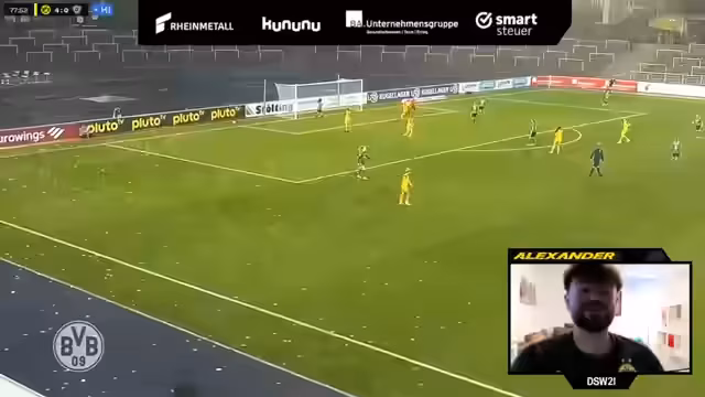 00:55:32Der Streamer macht Eigenwerbung für das Spiel in der virtuellen Bundesliga am Dienstag gegen Paderborn und hofft auf Unterstützung. Kurz vor der Halbzeit fällt das 2:0 für den BVB durch Madita Sommer. Kurz darauf gibt es einen weiteren Elfmeter für den BVB, der jedoch von Maratay verschossen wird. Der Streamer spricht aus eigener Erfahrung über das Gefühl, einen Elfmeter zu verschießen. Mit einer 2:0-Halbzeitführung geht es in die Pause. Der Streamer lobt die verdiente Führung und die Bemühungen des Gegners, mitzuspielen. In der zweiten Halbzeit fällt das 3:0 durch An-Sophie Vogel nach einem super Pass von Komulka. Kurz darauf gibt es den dritten Elfmeter für den BVB, der zum 4:0 verwandelt wird. Der Streamer äußert die Überzeugung, dass das Spiel damit entschieden ist und verspricht den Zuschauern eine Überraschung, sollte der BVB das Spiel nicht gewinnen.