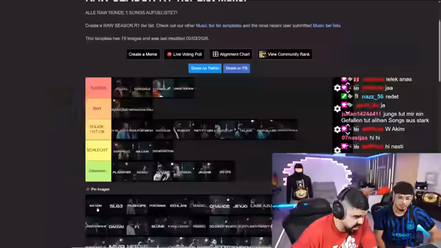 01:09:08Der Stream beginnt mit einem gemeinsamen Ranking der Künstler aus der ersten Runde der Raw Season. BZ und der Streamer führen eine lange Debatte über die Einstufungen in Kategorien wie 'stark', 'solide', 'BZ-Blick' und 'Jobcenter'. Sie bewerten die musikalischen Leistungen subjektiv, wobei auch die Künstler-Persönlichkeit und der Erfolg auf Plattformen eine Rolle spielen. Die Bewertung wird durch technische Probleme und manuelle Sortierung der Künstlerliste unterbrochen, was den Prozess verlangsamt. Das Ranking dient als Meinungsäußerung und nicht als offizielles Turnierergebnis.