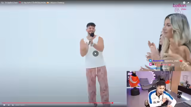 03:00:19Es wird für den eigenen Snapchat-Account geworben und die Zuschauer werden aufgefordert, den Account zu adden. Zudem wird das baldige Erreichen von 2000 Subs im September angekündigt. Danach wird das Format 'Pop the Balloon' mit Bachelor Baby vorgestellt, ein Format vom Momoschein. Es wird beschrieben, dass es um Single-Girls geht, die einen Single-Mann kennenlernen können. Wenn ihnen der Mann gefällt, sollen sie den Ballon behalten, wenn nicht, platzen lassen. Als erster Kandidat wird Lukas Rieger vorgestellt, der aus der Nähe von Braunschweig kommt und typische Hobbys wie Gym, Sport und Auto fahren angibt. Es wird ironisch kommentiert, dass er keine Lust zu haben scheint und wenig Selbstbewusstsein ausstrahlt. Seine Präferenz für blonde Frauen wird ebenfalls thematisiert.