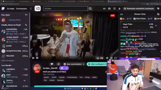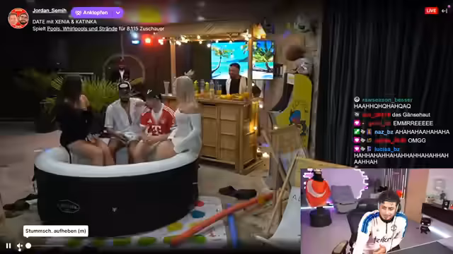 02:02:01Es wird über die Zuschauerzahlen während verschiedener Segmente des Streams gesprochen, wobei ein Rückgang während der Reaktion auf Jamal und ein Wiederanstieg beim Pool-Stream festgestellt wird. Es wird gefolgert, dass der Pool-Stream anscheinend beliebter ist. Die Streamer scherzen über ein mögliches Date und vergleichen es mit dem aktuellen Erlebnis. Es wird eine Abstimmung im Chat initiiert, um herauszufinden, welches Team (John oder Sami) besser ankommt. Es folgen humorvolle Kommentare über die Füße von Xenia und die Möglichkeit einer Zugabe. Die Streamer verlassen den Poolbereich, was zu unangenehmen Momenten und Spekulationen führt. Es wird über Musikwünsche und persönliche Vorlieben diskutiert. Einer der Streamer äußert den Wunsch, in zehn Jahren in der Psychiatrie zu sein. Es wird versucht, dem Team Nachrichten zu schreiben, wobei nicht klar ist, ob diese ankommen. Die Streamer werden von Zuschauern beobachtet, die kommentieren, dass sie nass sind. Es wird über eine Umarmung zwischen zwei Streamern spekuliert.